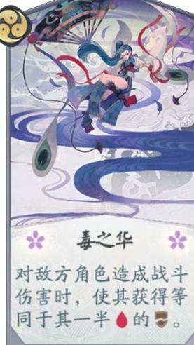 卡牌效果简析:可额外造成相当于目标当前血量一半的伤害,并能触发一次寂寥心象的特效。进入三勾阶段后,对敌方牌手或式神均能打出高额输出。但因其生效偏后期,实战中通常不会投入过多毒之华,且与鸩现有主流玩法契合度较低。