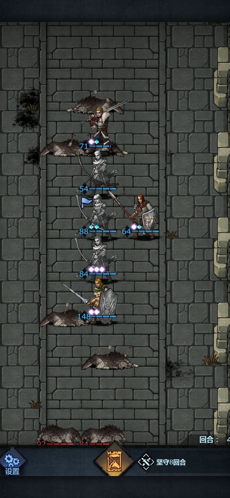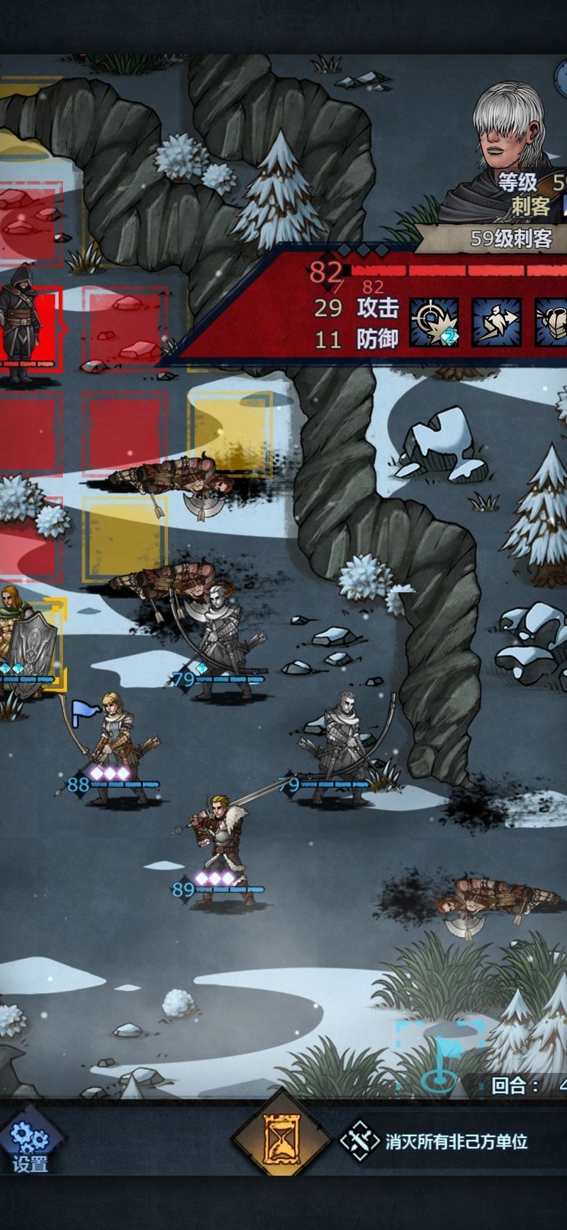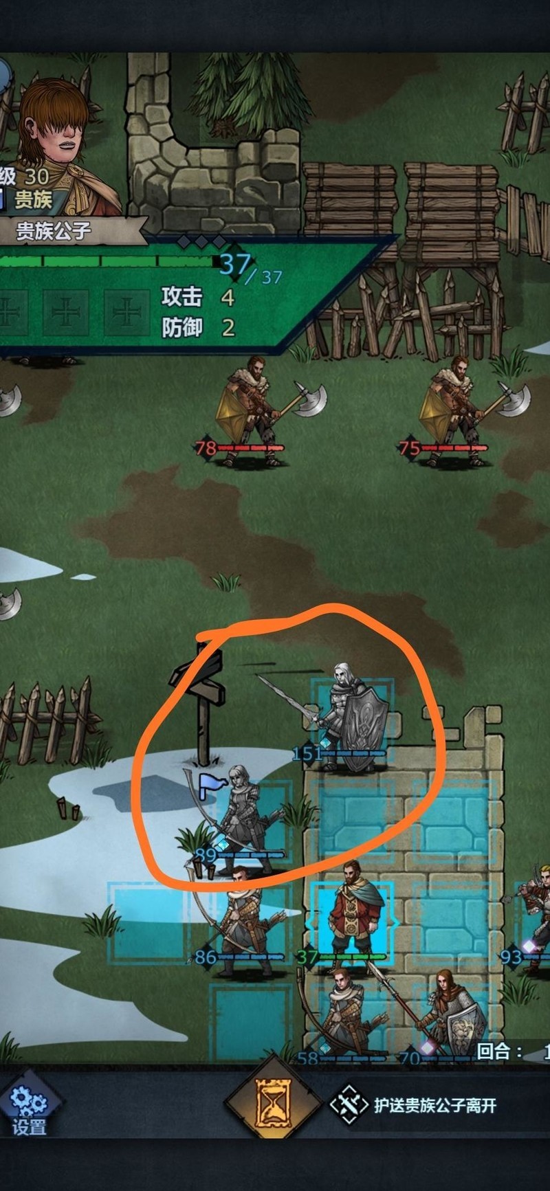 进入第四回合,上方仅剩刺客,我们等待其进入攻击范围即可。大剑所在位置主要用于保护输出,防止新人伤害不够时长弓被直接 targeting,起到承伤作用,确保后续回合稳定输出。