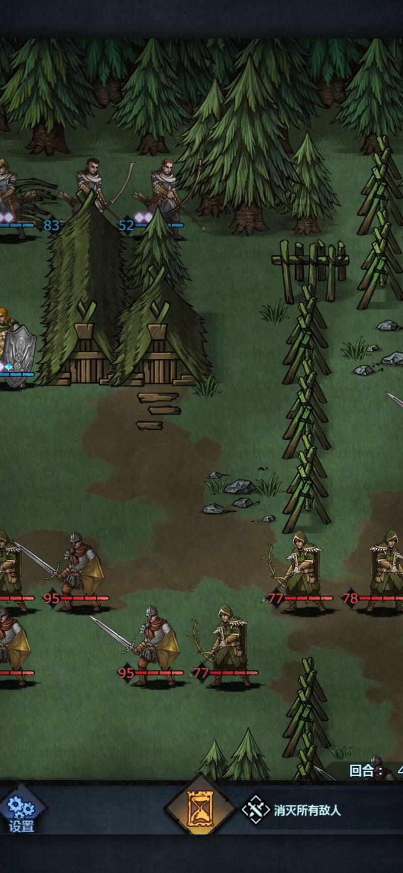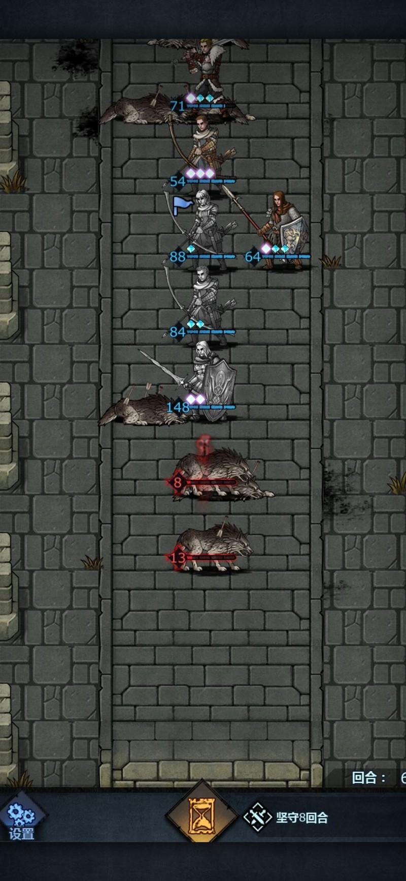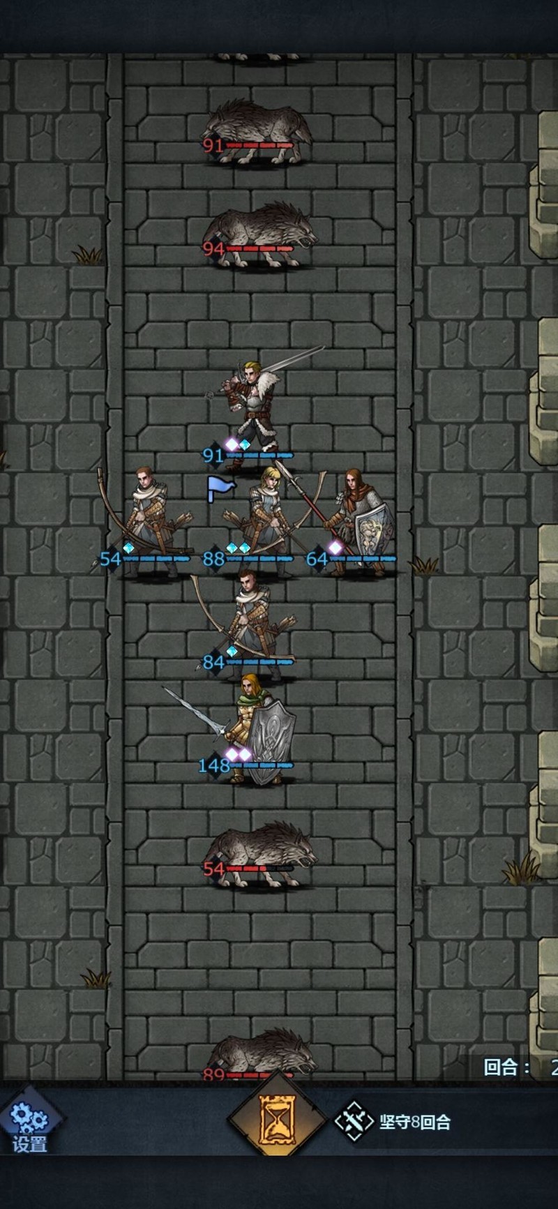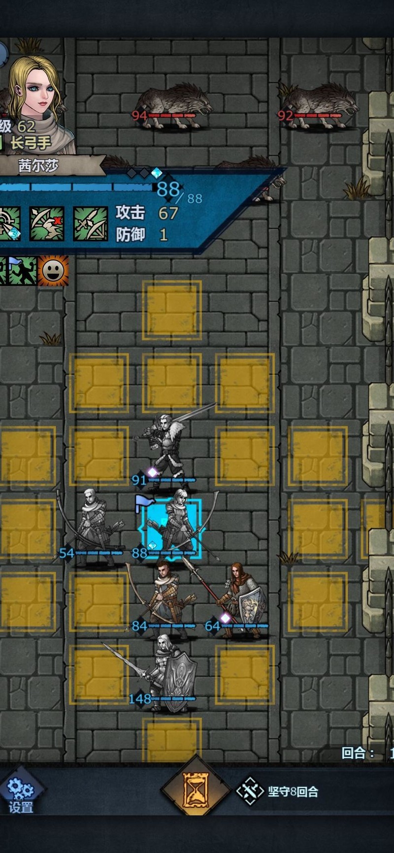 进入第四回合,上方仅剩刺客,我们等待其进入攻击范围即可。大剑所在位置主要用于保护输出,防止新人伤害不够时长弓被直接 targeting,起到承伤作用,确保后续回合稳定输出。