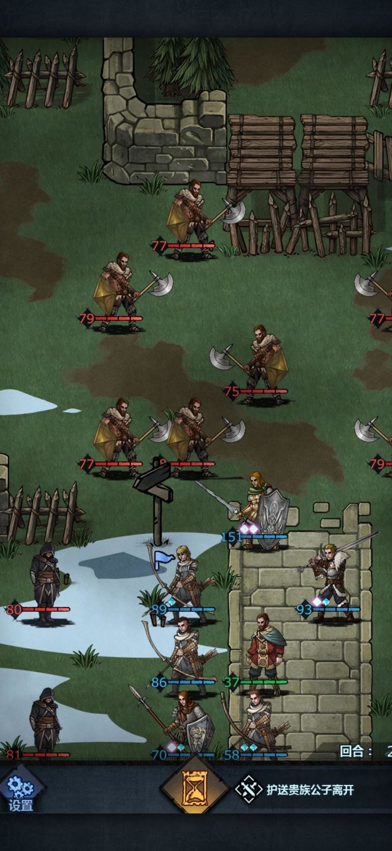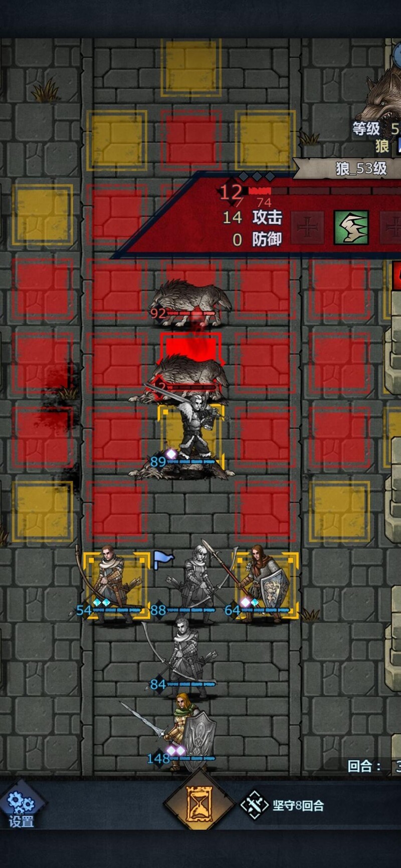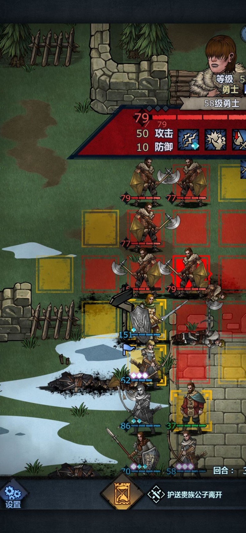 进入第三回合,对方已能攻击我方禁卫。实际上此关只需三名长弓手即可完成,其余角色仅为辅助。设置禁卫是为防止新手因输出不足导致无法击杀敌人,预留容错空间。
