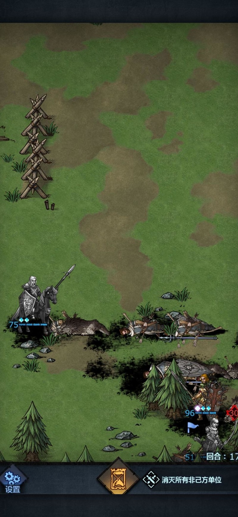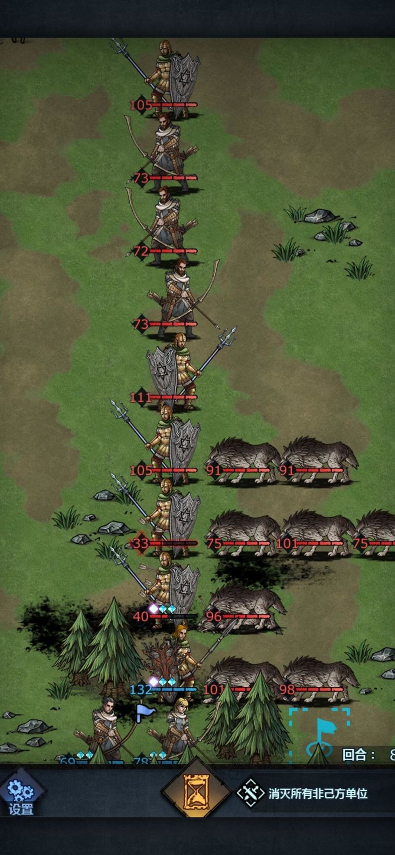 此图同理,因敌方配有长弓,可先将骑兵置于其射程外,待长弓进入我方攻击范围后迅速冲锋,优先歼灭长弓单位,以降低威胁。