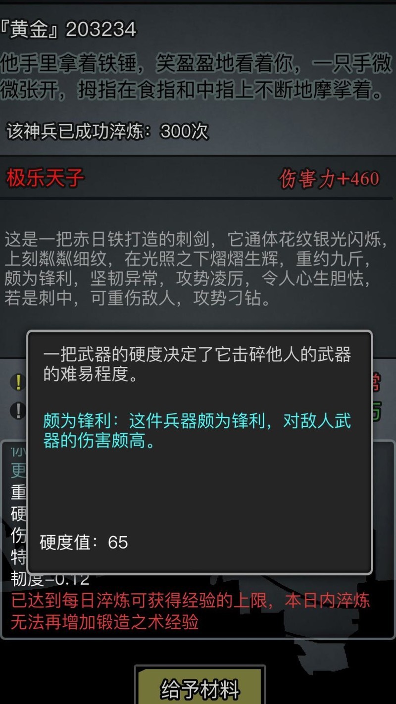 最终我的神兵实际属性为:伤害460,硬度65,韧性120,重量11。