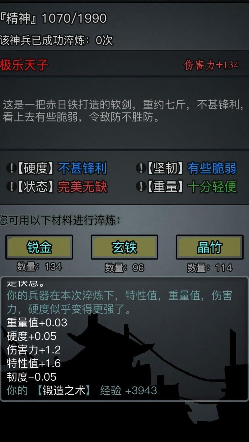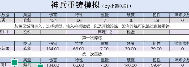 软剑锻成后无需淬炼,直接前往华山寻干将重铸为短剑。重铸后神兵的伤害与重量保持不变,硬度提升至短剑上限140,韧性则接近翻倍,整体性能显著增强。