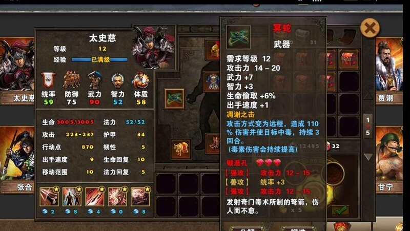 太史慈与黄月英搭配效果更佳,太史慈配合鹰卫可迅速施加中毒状态,黄月英一技能基本可令敌方全体中毒,张合在部分剧情关卡中也有不错表现。