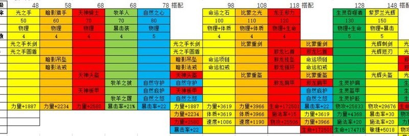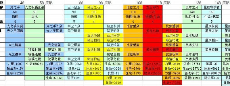 资源有限时,可跳过88级王下禁卫套装及缺少的命运衬肩,优先选择98至118级的肉装搭配,元素职业同样适用。