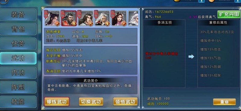 拳法武技包括一阳指、一指禅、玄冥功、寒冰掌、龙爪手、七伤拳及赤练神掌等。