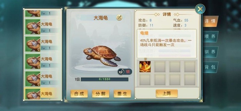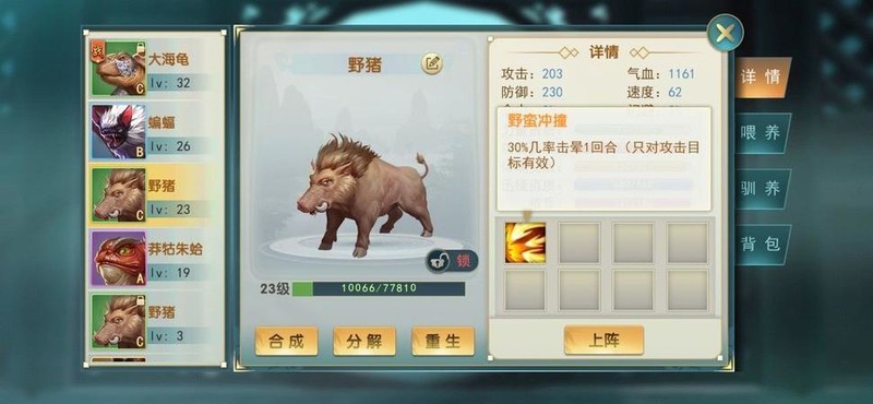 建议准备3只带专属技能的C级乌龟和3只带专属技能的C级野猪,优先选择由乌龟与野猪合成的双特技组合,效果更佳。