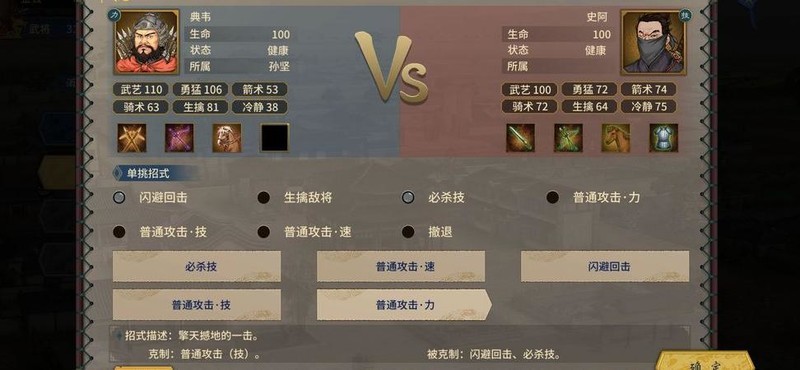 建议首回合释放必杀技以造成高额伤害,第三回合使用闪避反击,此时电脑通常也会发动必杀技。熟练掌握这一节奏,即使面对同等战力的武将也能轻松取胜。