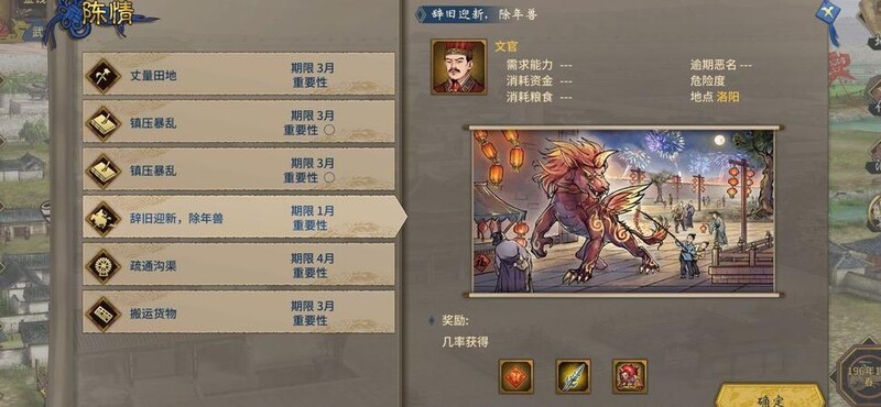 每年二月开启年兽挑战活动,玩家可通过陈情列表参与。年兽拥有75万兵力,挑战难度较大。前期建议仅派100士兵攻击以获取红包奖励,红包可用于赏赐武将或出售换取金钱,是积累资源的重要途径之一。