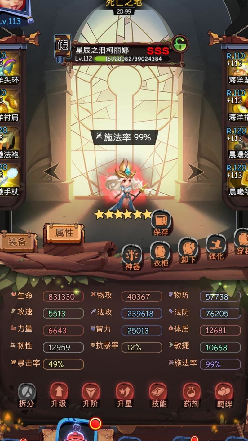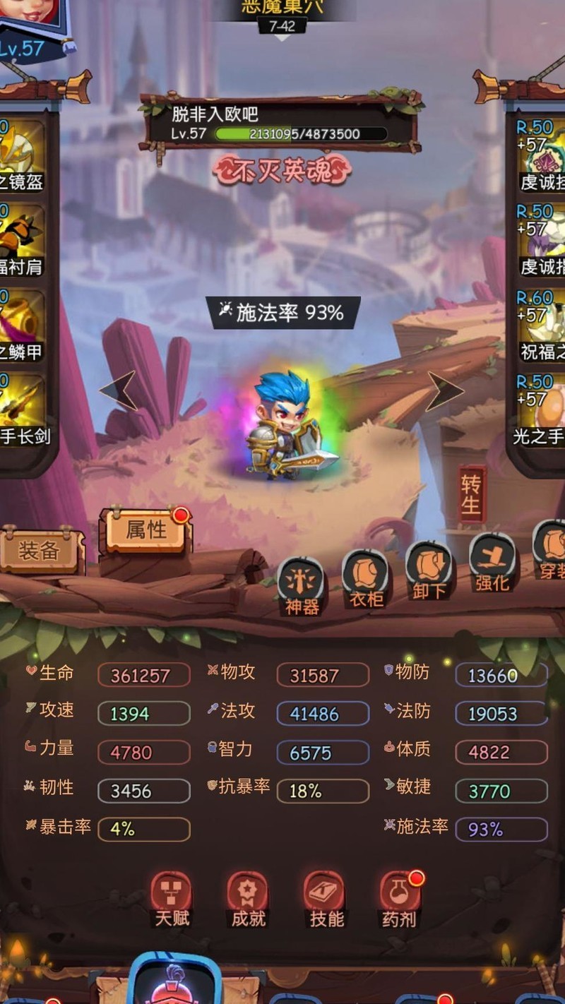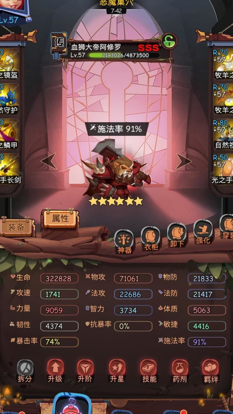 目前狮子天使已升至73级,无尽模式通关至760关卡11-197。进入九图后奶妈回复压力增大,建议必带大魔导,并搭配速度装备确保其施法快于狮子且能满技能释放。获得神器后,推荐采用男主、女主、狮子、天使与大冰配合大魔导的阵容,提升整体输出与续航能力,有效推进后期关卡。