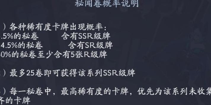此处所指为仅分解拥有两张以上的卡牌(即保留两张,多余才分解)。由于卡牌爆率及合成难度的设定,合理的收集顺序应是先集齐所有R卡,再逐步完成SR,最后才是SSR。百闻牌独特的开包机制决定了已分解的SR或SSR卡在未来仍有可能重新抽出。一旦抽到一张已有SR卡,意味着损失790御札;若抽中已有SSR卡,则直接亏损3300御札,这种资源浪费比例极为惊人。这一阶段通常发生在新人玩家初期。新手起步时卡池薄弱,卡牌分布零散,难以组建完整且具备战斗力的卡组,因此容易冲动分解部分卡牌以强行凑出一套阵容。然而,这种困境持续时间并不长,只要能克制住急于组队的心态,坚持合理规划资源,对普通玩家而言,后续的游戏体验将实现显著提升。