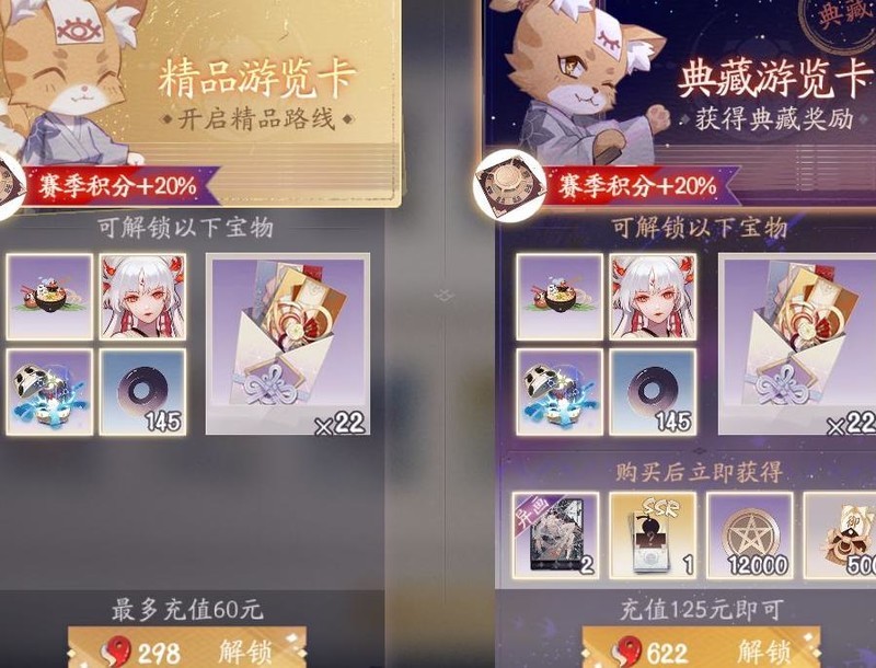 由于本次为首次活动暂无八折券,后续将会有八折优惠,因此以下计算均以享有八折为基础(仅限与集卡相关的内容)。精品浏览卡售价48元,可获得22包卡,总价值达132元。对于轻度充值玩家来说,这是每个赛季必购的项目,也是游戏中唯一长期稳定且性价比极高的礼包,回报非常可观。只需完成日常签到及每日任务即可轻松集齐,无需投入过多精力,体验轻松。典藏卡价格为98元,在此基础上多支付50元可额外获得一张随机SSR卡和500御札。考虑到新手前期极度缺乏SSR卡,所赠SSR必定为未拥有卡牌,相当于以50元获取5300御札(约47元价值),即仅花约3元便可获得一张高品质异画卡。是否购买取决于对异画卡的偏好,非必备之选。
