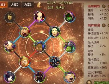三:战阵篇。目前我采用的是纯粹的秘法系战阵配置,因部分孔位尚未开启,暂用一张刺杀系卡牌过渡。待所有孔位开放后,将替换为完整的秘法系组合。最终成型的战阵所示,左上角将部署五火球术士,可同时激活全部秘法效果,并附带少量狂暴加成。