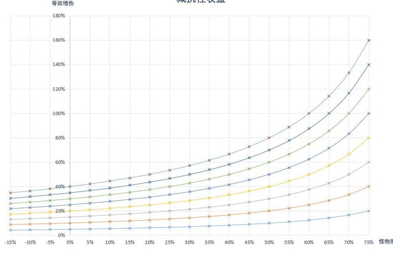 针对不同抗性水平,展示减抗效果对应的等效伤害提升曲线图。