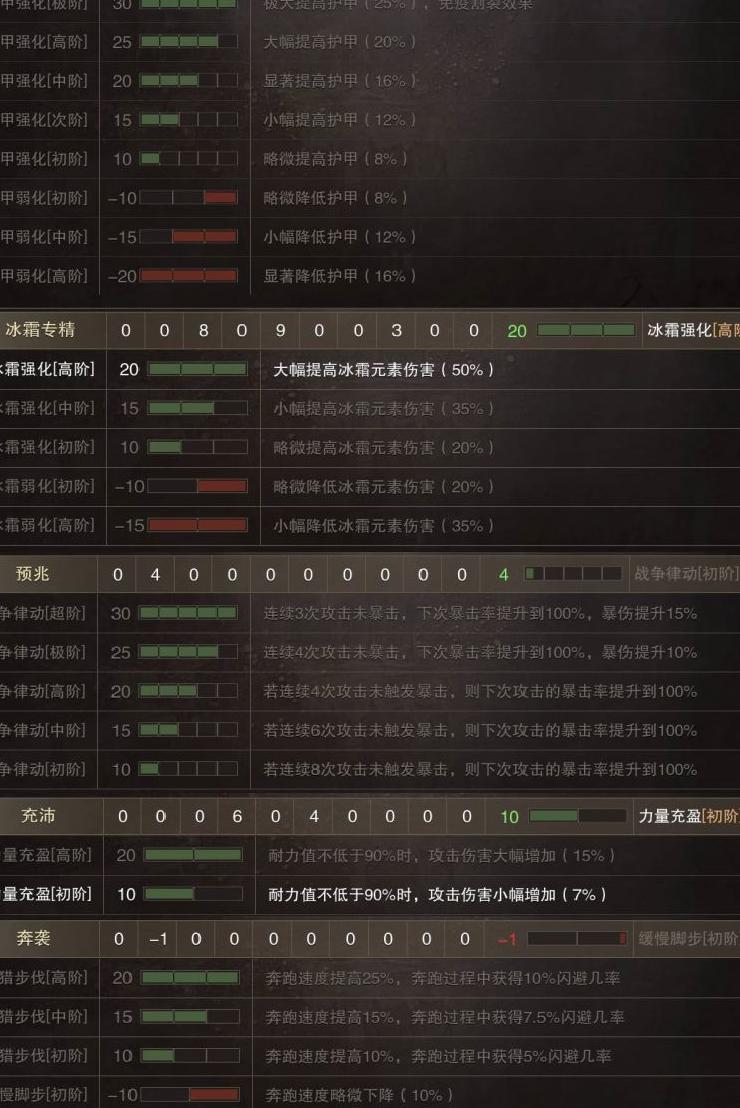 需注意,游戏中所有特技在未达到10级前均无任何加成效果,即-9至9级等同于无效;达到10级后,部分特技每5级为一阶段(如10至14级效果相同),部分则每10级为一阶段(如10至19级效果一致)。接下来讨论冰霜武器的防具搭配选择。