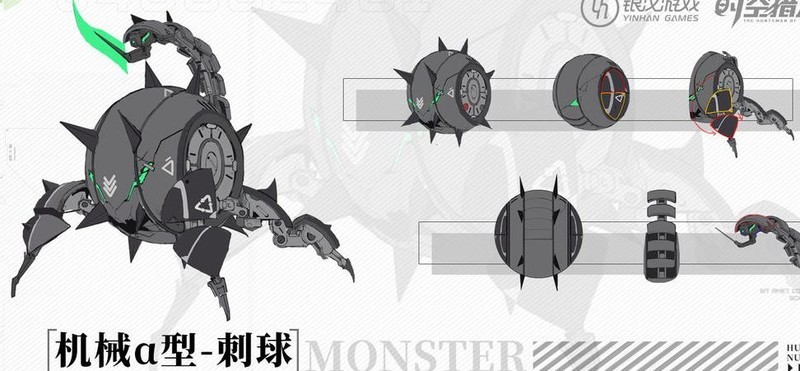 与猛禽类似,本为废弃机械残骸,经原核融合后不断吞噬其他融合体实现自我改造。苍星研从捕获个体中发现其核心由多种轮胎构成,遂将其命名为机械α型-刺球。