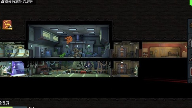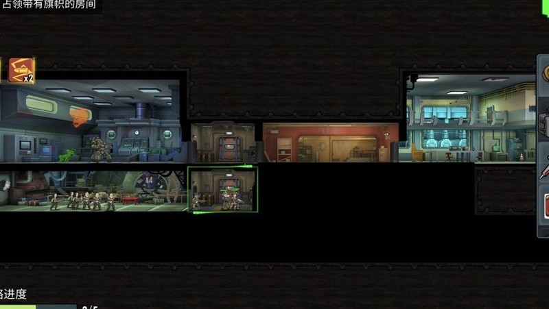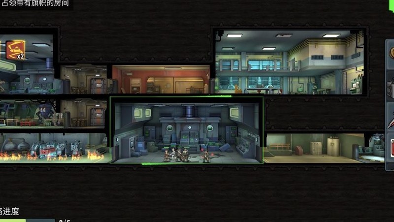 第二关沿指定路线前进,沿途小怪均伴随两只绿色犬类,但有李医生与凯德支援,自动战斗轻松应对。左上区域传送门将遭遇机械类小头目,右上毒气房间可获取增益效果。清理第二波敌人后,抵达旗帜所在房间。