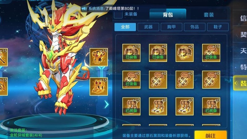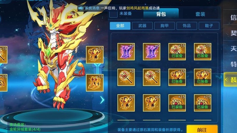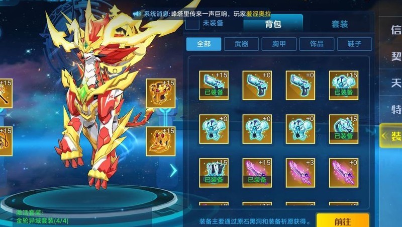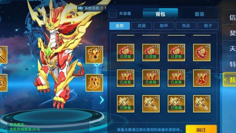 若有人运气极佳,未充值便获得一两套金色装备,确实值得恭喜。但这仅是第一步,接下来的强化之路才真正考验耐心。金色装备升级需消耗大量星能,等级越高,成功率越低,所需资源也越多。将一件金装提升至+15,大约需1500点以上星能。而多数玩家初期往往忽视星能积累,后期强化时难免面临资源匮乏的窘境,过程极为艰难。
