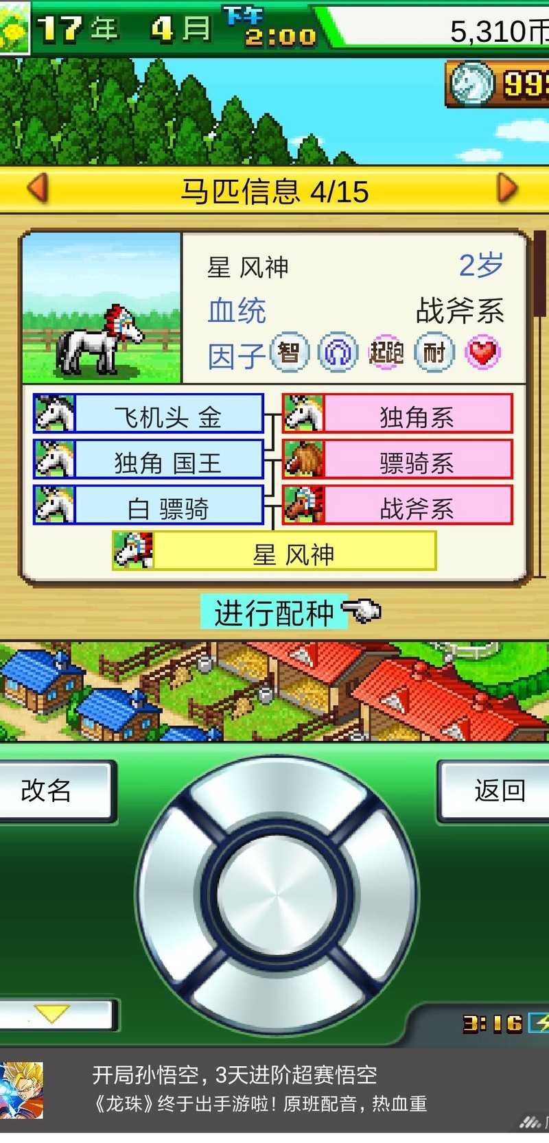 通过反复读档,我在第11年成功培育出拥有四高一低优质基因的狮子王,方法是幼马成年后立即送去配种,持续优化遗传因子。