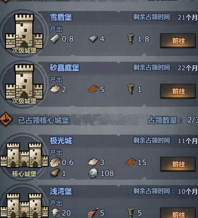占领城堡涉及诸多策略考量,实际核心仅需控制两座,第三座常留空。因丰收节仅能祭拜两次,资源栏位有限,若同时生产所需与非需的蓝色材料,易造成挤压。以熊掌和毛皮为例,二者同属一栏,为获取熊掌而顺带占领毛皮城堡,结果导致八月积压大量毛皮,熊掌却寥寥无几,得不偿失。