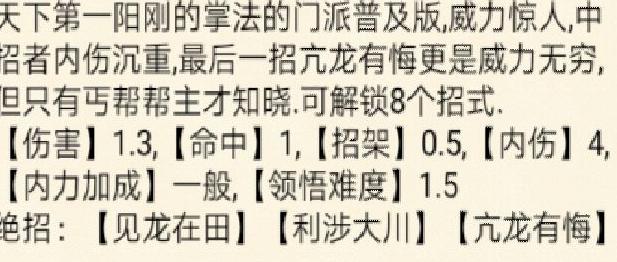 丐帮推荐主修拳法,尽管前期可用打狗棍后期转霸王枪,但整体强度有限。相比之下,降龙十八掌兼具控制与高输出,实战表现更佳。唯一缺点是见龙在田攻击内力高于自身的目标时,有一定几率被反震,不过发生概率较低。属性加点建议采用6111分配,提升综合战斗力。