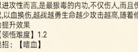 血量越低,外功伤害越高;开启嗜血后提升命中,免疫控制,施展血刀武学时可吸取生命。