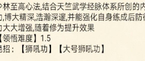 装备后提升防御,狮吼功可清除自身负面状态及对手增益效果,部分绝学不受影响。