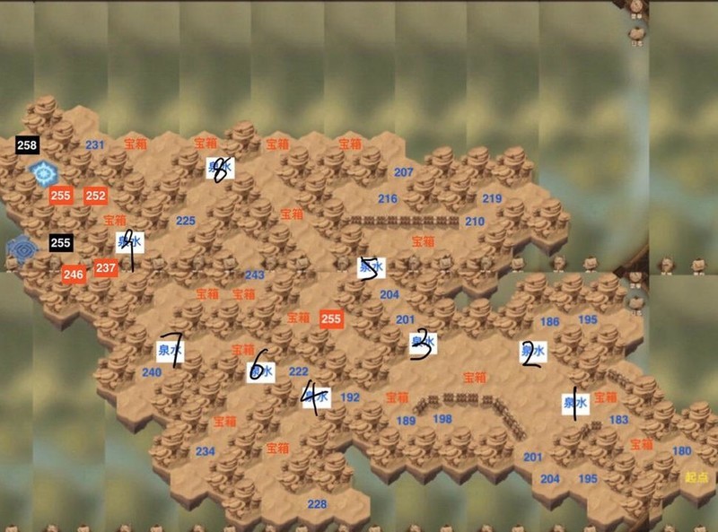 路线三:先攻击222,饮用泉水8,前往左上角击败225并使用泉水9。接着挑战237和246,若246未击倒则饮泉水6,最后开启宝箱。