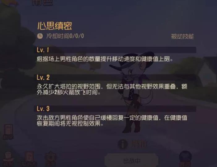 塔拉的一技能被动效果会随场上男性角色数量而改变,每当她放走一名鼠方男性角色,自身移动速度便会下降。当该被动升至三级后,攻击敌方男性角色可触发生命回复,且在回血期间处于无敌状态,不会受到任何投掷物或控制类技能的影响。