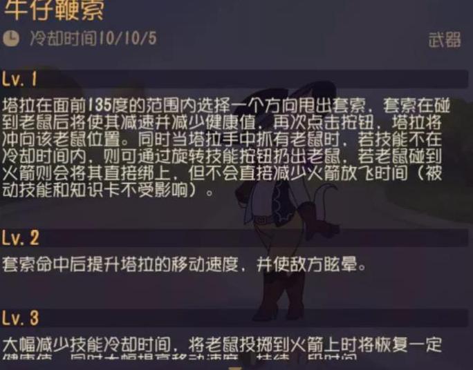 塔拉的武器技能包含两种关键效果:一是勾,要求玩家精准掌握鞭子的命中;二是丢,在抓住老鼠后,需灵活运用鞭子进行多种操作。熟练掌握这两项技巧,才能充分发挥塔拉的战斗优势,提升实战表现。