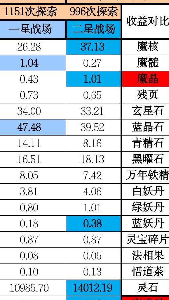 相较于一星战场,二星战场的魔核收益明显减少,但在关键资源方面提升显著:魔晶产出约为一星的2.35倍,定魂丹更是达到3.76倍。其他资源相差不大,唯独石材方面,一星战场略多于二星战场,整体而言二星在核心资源上优势更为突出。