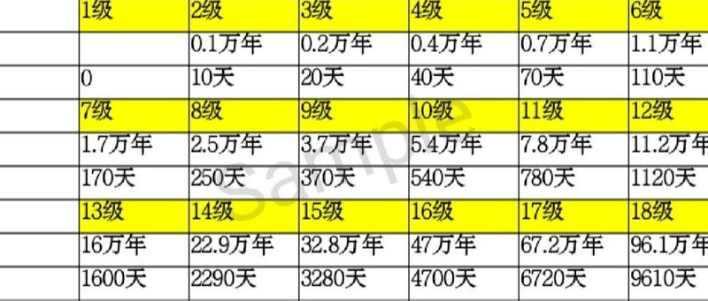 七品耗时43.6天,八品87.2天,九品则需174.4天完成。