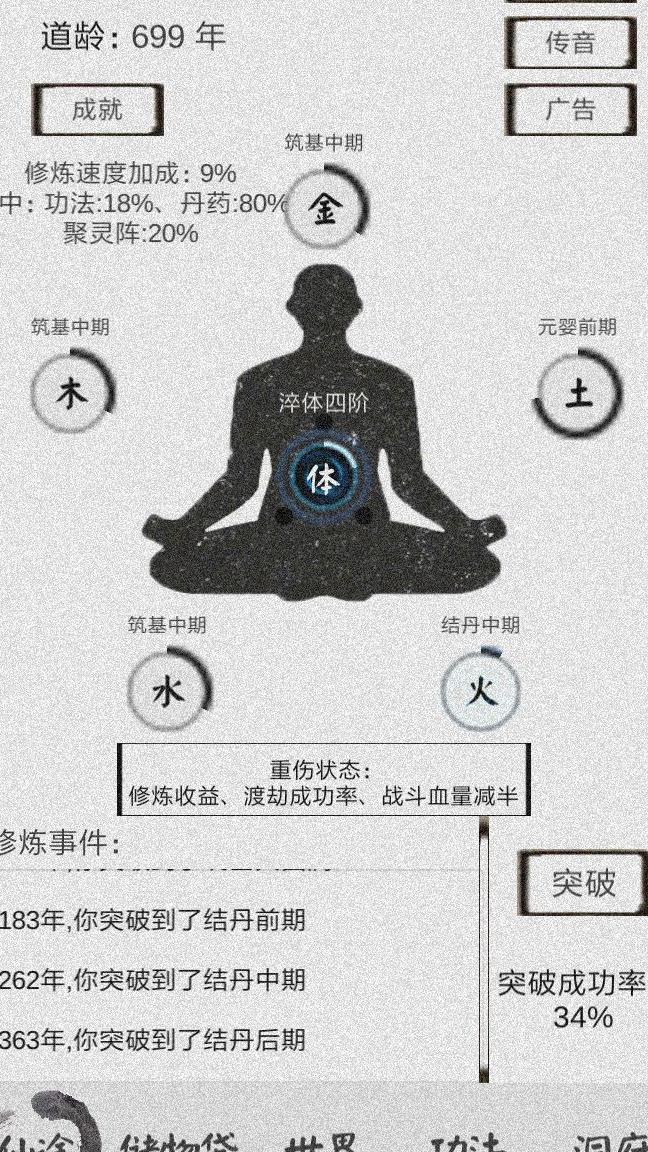 结丹期新增药田与法宝,可前往荒芜之地切磋对战,此阶段通常持续四五天左右。
