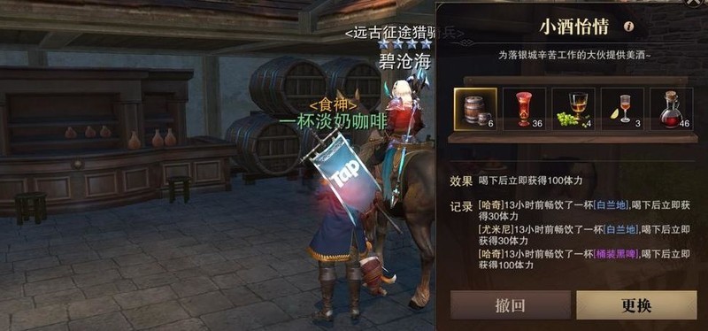 若酒馆无酒,所示体力变红,伙伴将停止工作。