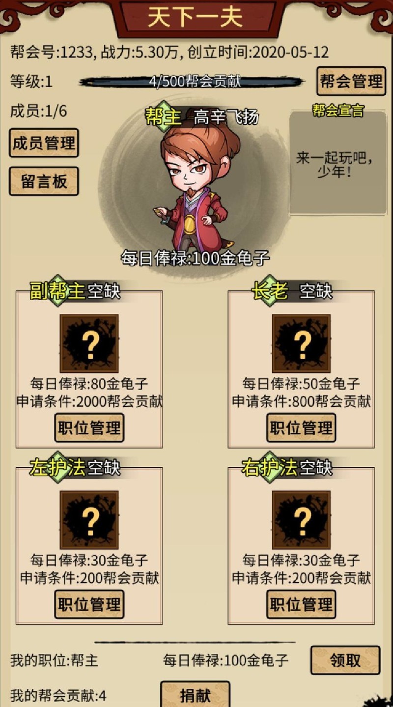 可申请帮会职位,除帮主外设四个职衔,成功获任者每日可领取金龟俸禄。
