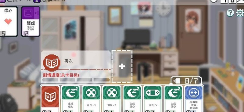 第一轮四张剧情卡在触发音效后均会生成疑虑卡,因本关仅有沮丧情绪,建议前三张用完后暂缓使用第四张,优先积累信心卡以增强后续应对能力。