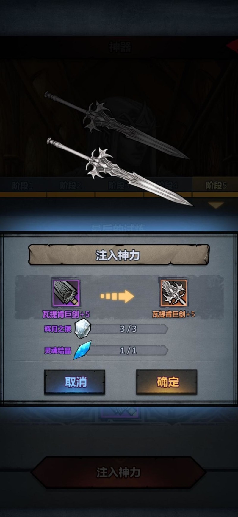 传家宝尽量提升至高等级,尽管任意强化等级最终都能完成神力注入,我曾使用强化5的大剑进行圣剑测试。