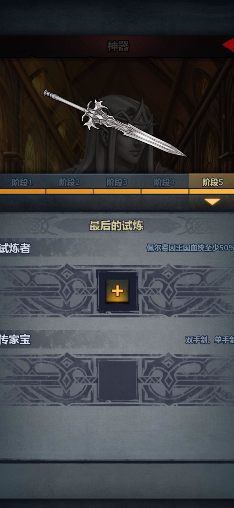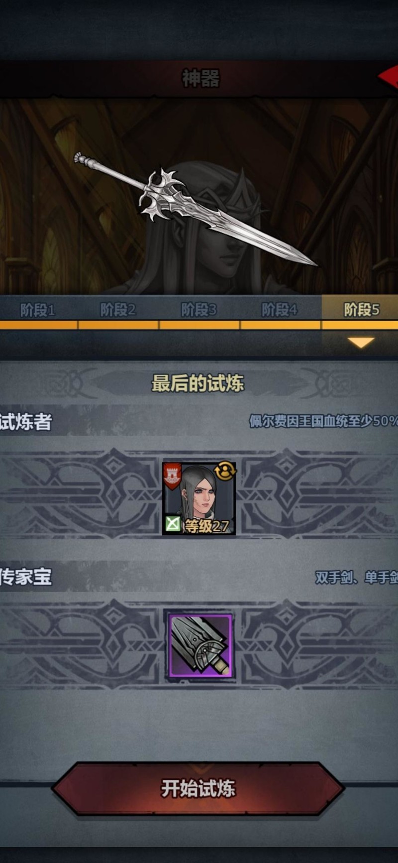 试炼者需携带单手或双手剑传家宝,并缴纳50佩尔血方可参与。