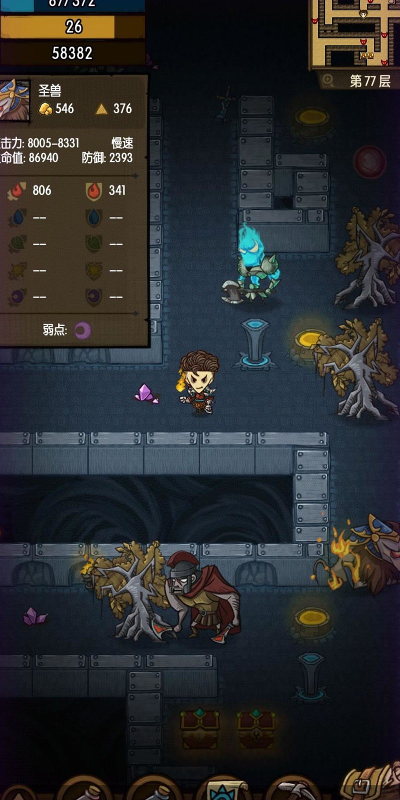 73层将遭遇英灵武士,75层会出现战神,77层则有圣兽出没。注意圣兽普攻伤害极高,切勿轻易挑战;若执意战斗,需采用一普攻一虹吸策略,并确保穿透高于怪物防御,及时使用大红补血,否则极易失败。