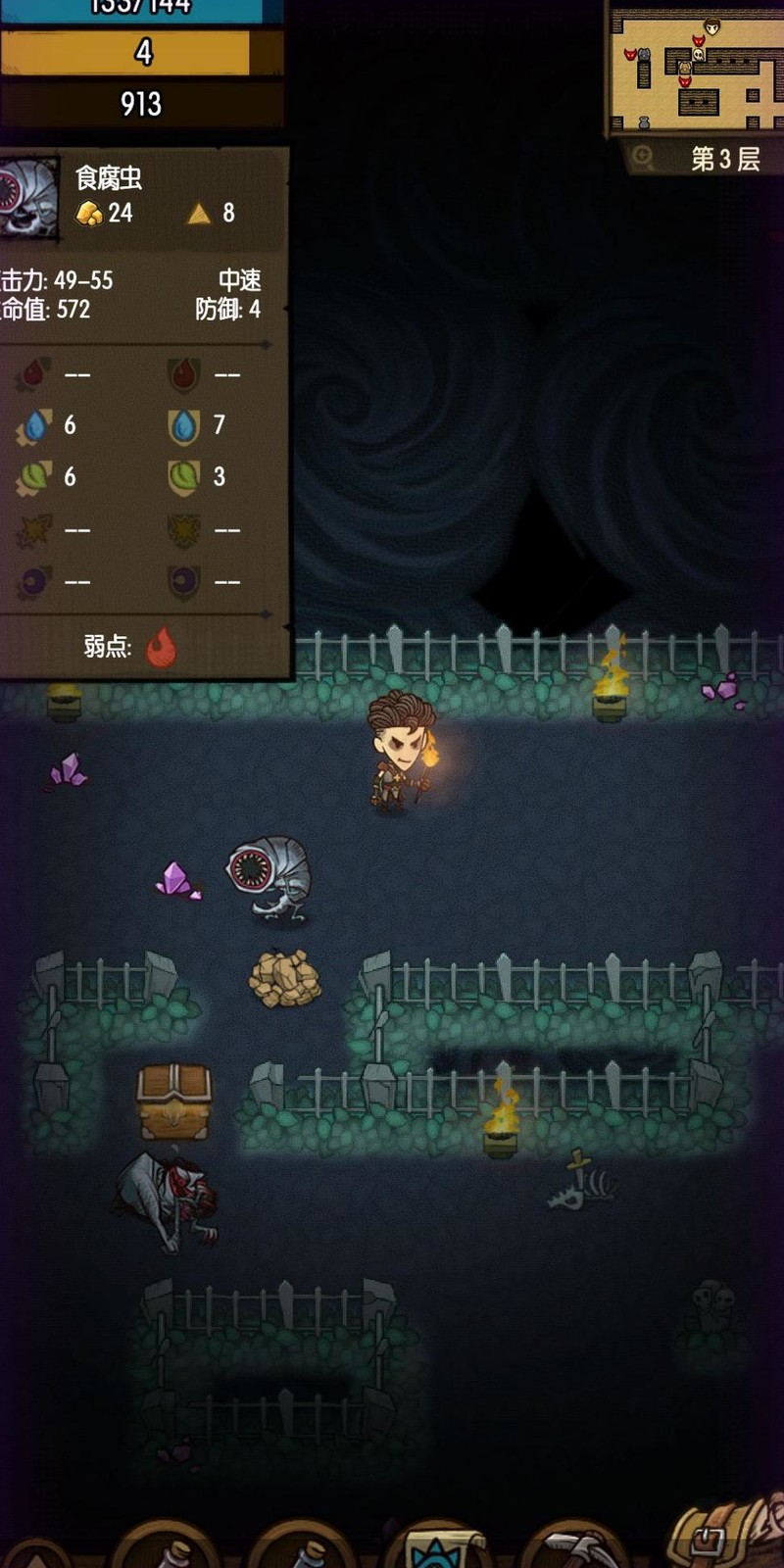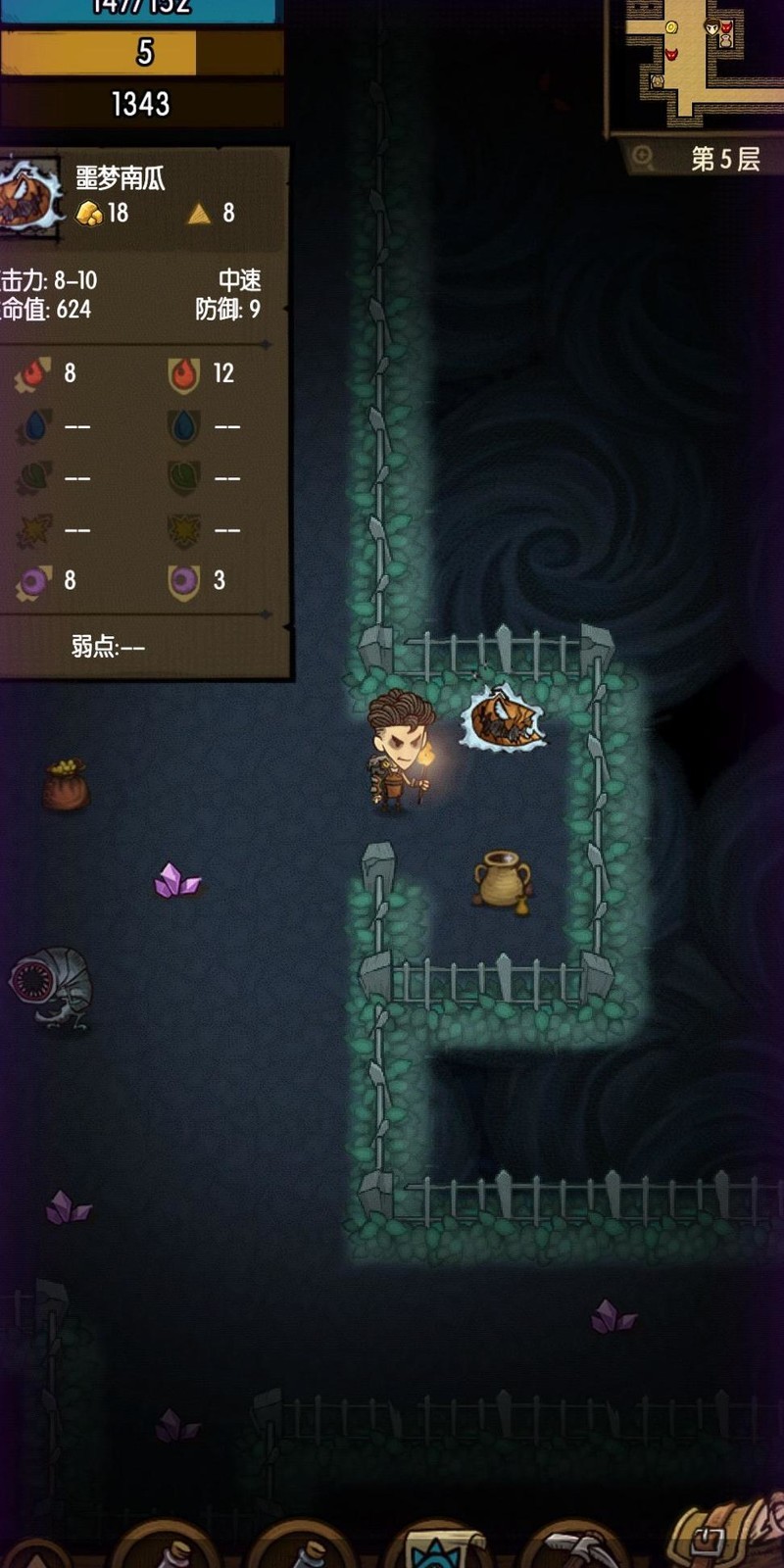 清理除3至5层食腐虫与噩梦南瓜外的所有区域,被箱子或罐子阻挡的也无需攻击。其余怪物全部清除,完成后状态所示,依旧未穿鞋子。