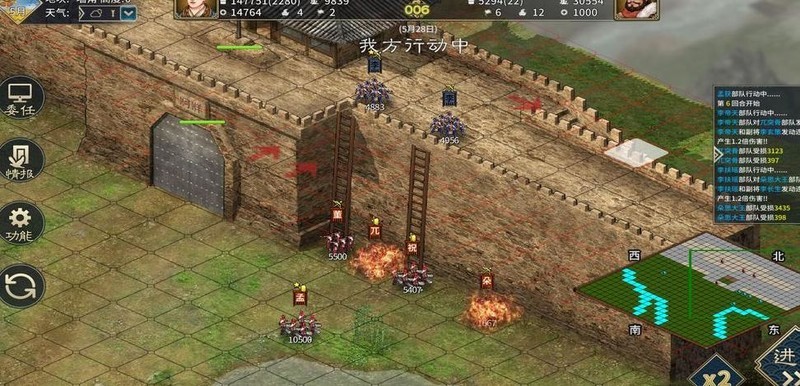 两支部队能否应对四架登城梯的威胁?火箭在此起到关键作用,可迅速焚毁敌方器械。每支部队负责焚烧一架登城梯,合力摧毁其中两架。随后通过精准布阵与卡位拦截,有效阻断敌军进攻路线,从而化解当前危机,守住防线。
