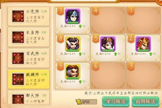 麒麟阵可分摊伤害,回合结束时按比例回血,前期具备一定优势。