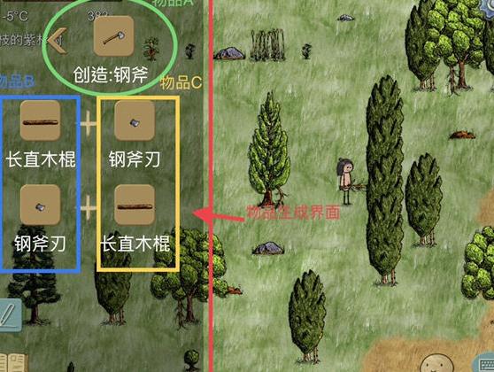 例如,点击上方物品用途界面中的物品2钢斧,将跳转至钢斧的制作界面;再点击其中的组件C钢斧刃,合成说明会进一步展示钢斧刃的获取方式。通过依次点击物品1、2、3及B、C图标,可逐层查看各组件的生成界面,从而逆向推导出整个合成路径。