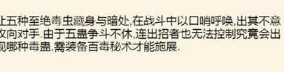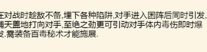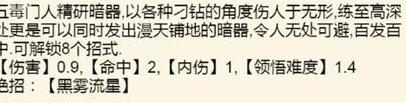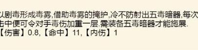 五毒暗器实用性较低,上手难度不低,仅适合前期过渡使用,主要附带中毒效果,看完绝技即可弃用。