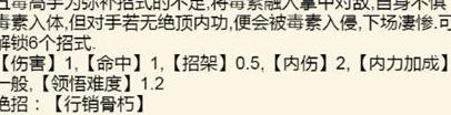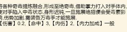 这门绝技名为行销骨朽,表面看伤害平平,命中与内伤属性均不突出,内力加成效果也较弱。真正厉害的是其特殊效果:一旦命中,必定使目标中中毒5并附带软筋散。中了软筋散后,对方每使用一次技能便会损失气血,持续五回合,且暗含降低身法的负面状态。技能消耗仅五百内力,冷却时间短至两回合,实用性极强。