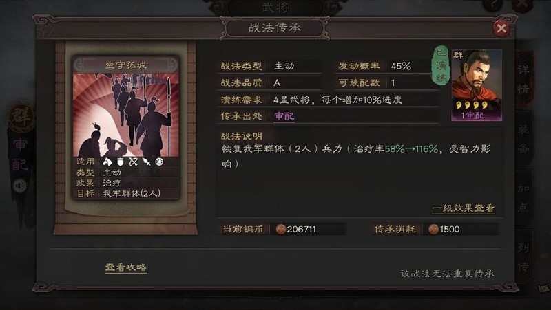 每回合恢复全部治疗量,效果不错,尤其适合孙坚和曹仁使用。