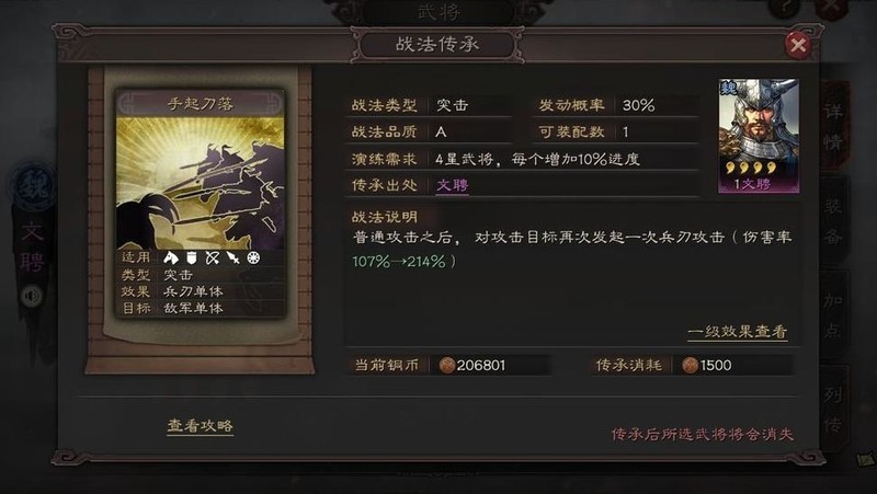 文聘所授技能,伤害高达215%,为追击类最高,适合颜良、太史慈、孙策、夏侯渊等武将使用。