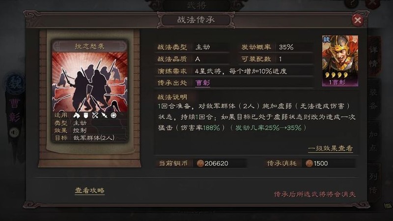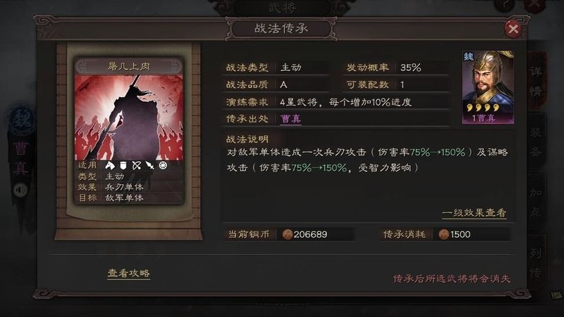 曹真技能可拆解,是瞬发主动战法中伤害最高者,单次伤害达物理150%加法术150%,尤其适合物理与智力双高的武将,如吕蒙等。