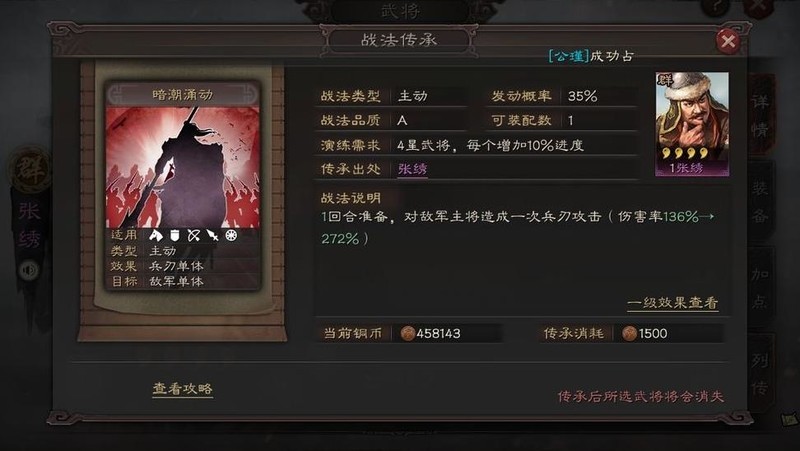 暗潮涌动拥有35%释放率,蓄力一回合后对主将造成272%伤害,实战中使用较少,效果一般,不建议选用。