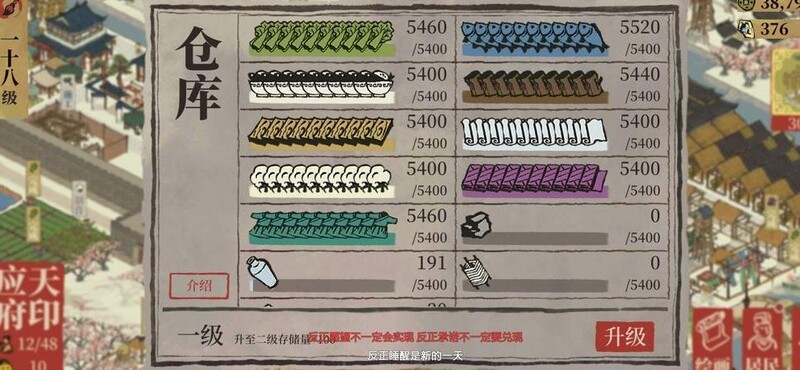 当前的关键是合理控制州府升级节奏。江南中建筑与物资的解锁不仅取决于角色等级,还需满足州府等级条件。建议暂缓提升至六级州府,先将粘土矿和陶瓷厂升至四、五级,充分利用现有资源积累粘土与陶瓷储备。若过早升级州府,可能因角色等级未达21级而无法建造新设施,造成资源浪费。掌握好升级时机,才能更高效地推进发展进程。